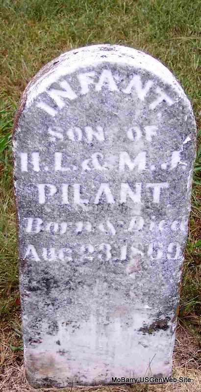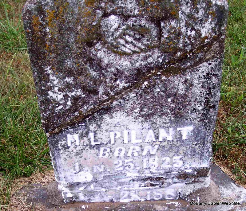 Research Note: This stone probably reads H. L. and the shaving cream hung over the top of the H. - Henderson Lewis Pilant fell in a well that he was digging and died from the effects of the fall. Son of Kinchen Pilant and Anna Walker Harrison. His first wife was Harriet Bowles, married abt. 1844, AL. He second married Martha Jane Mithorne on Jan. 5, 1851 in Madison Co., AL. He third married Ursula Catherine Edwards in Mar. 1877, Barry Co., MO. | Note Loretta Pilant Vinson AL Marriage Index MO Marriage Records Phyllis Long Photo Diana Cope |