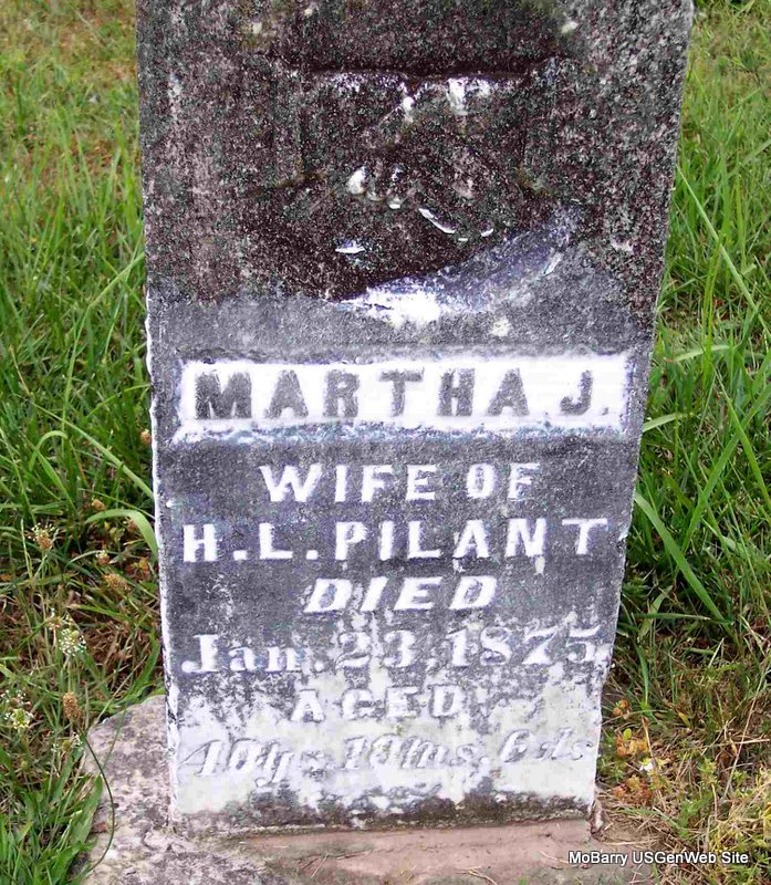 Jan. 23, 1875 | Inscription: "Wife of H. L. Aged 40 Ys, 10 Ms, 6 Ds " - Research Note: Second wife of Henderson Louis Pilant. Martha Jane Mithorne married Henderson Lewis Pilant on Jan. 55, 1851 in Madison Co., AL. | AL Marriage Index Phyllis Long Photo Diana Cope |