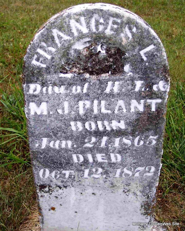 | PILANT, Frances Louisa | Jan. 21, 1865 | Oct. 12. 1872 | Inscription: "Dau. of H. L. and M. J." - Research Note: Daughter of Henderson Lewis Pilant and Martha Jane Mithorne. | Note Phyllis Long Photo Diana Cope |
