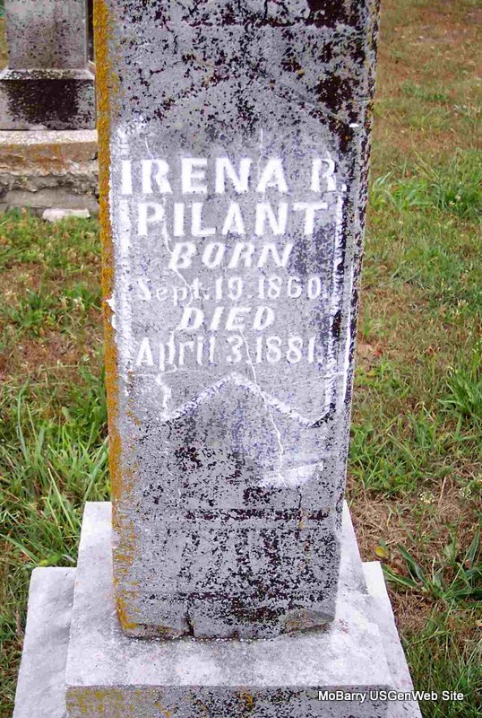 | PILANT, Irena R. | Sept. 19, 1860 | Apr. 3, 1881 | Research Note: Irena was the first wife of John Fernando "Frank" Pilant. |