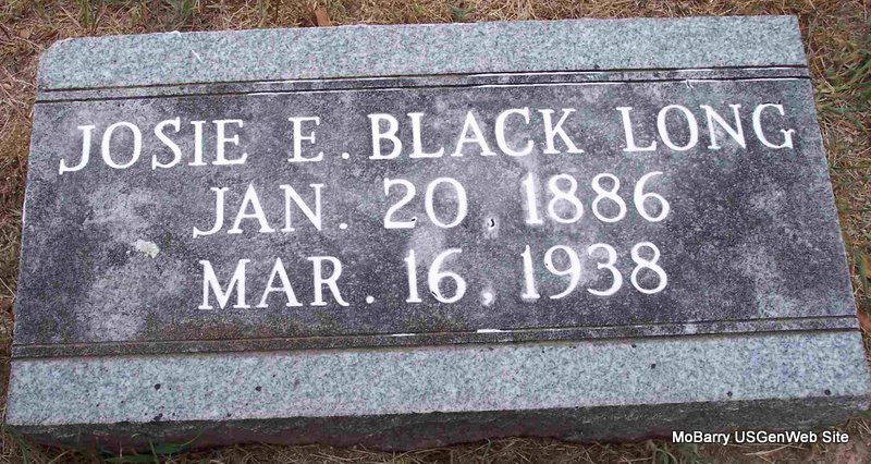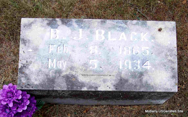 Research Note: His obit has birth date of Feb. 28, 1865 and his stone has Feb. 8, 1865. Death certificate has Feb. 18, 1865. Son of Jacob Black and Mary J. Kirkpatrick. Mrs. Bert Harper was the informant on the death certificate. His wife was Josie Elberta (Sears) (Black) Long, listed on this page as Josie Long. - Cassville Republican Oct. 30, 1919 - Circuit Court: Elberta Black vs. Jacob Black, divorce. - Cassville Republican, May 10, 1934 - Following a brief serious illness, B. J. Black, generally known in this community as "Babe" Black, passed away Saturday afternoon, May 5, at the home of his daughter and son-in-law, Mr. and Mrs. Bert Harper, age 69 years. Funeral services were held Sunday afternoon, conducted by Rev. R. M. Patrick and Rev. Erickson. Burial was made in the Pilant Cemetery northeast of Cassville one mile in the community in which Mr. Black had spent most all his life. The Horine-Culver Funeral Service had charge. Mr. Black was born at Rolla, Feb. 8, 1865. He was a son of the late Jake Black. Soon after his birth the family moved from Rolla to what is now known as the Black community northeast of Cassville on Flat Creek. B. J. continued to live there all his life. He was a very quite, unassuming man and a good citizen. He is survived by one son, Herbert and three daughters; Mrs. Dora Sturgil of Cato, Mrs. Gertrude Harper of Cassville, and Mrs. Flora Combs of near Butterfield. | Headstone Bonnie Black Hankins Photo Diana Cope Online Obit Cassville Republican, May 10, 1934 Death Certificate Phyllis Long |