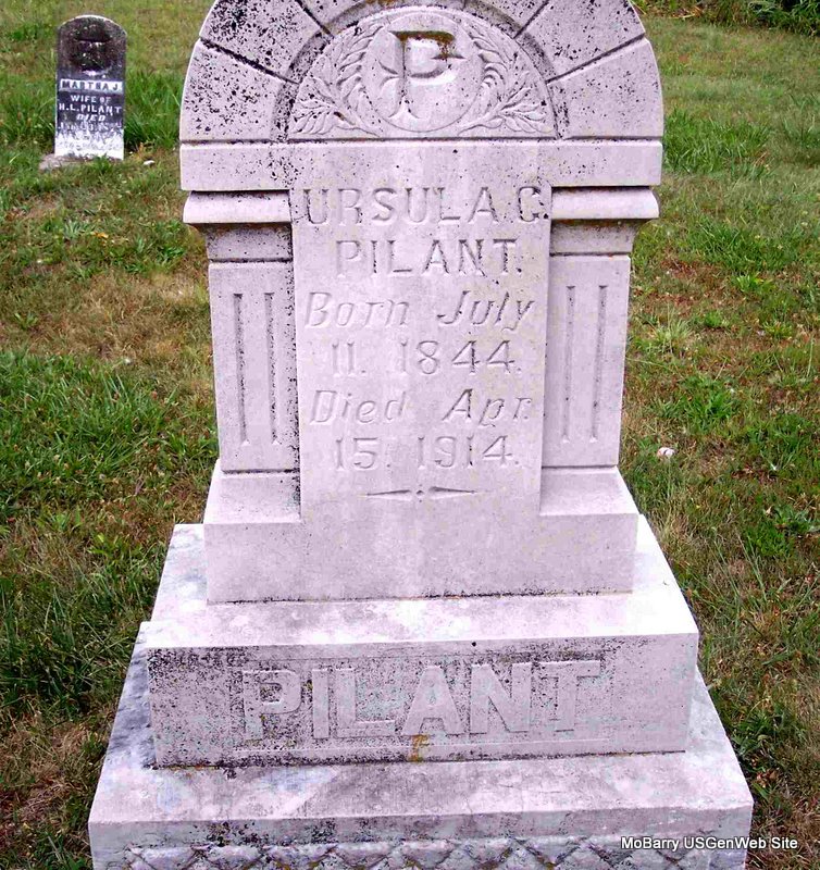 Research Note: Death Certificate states that her father was Tillman Edwards born in NC and her mother Eliza Jane Thornhill born in TN. Researcher Lyle listed she was born July 1, 1844 and died April 14, 1914, which is not what the stone or the death certificate reads and also listed that she was born in Cleveland, TN - death certificate states she was born in Bradley Co., TN. The post stated that she was a wife of Henderson Louis Pilant. That posting also had her name spelled Katherine - stone has "C." for Catherine, which matches the death certificate. Loretta Vinson stated she was born in Cleveland, Bradley Co., TN. - Henderson L. Pilant married Ursula C. Edwards on Mar. 30, 1877 in Barry Co., MO. Ursula Catherine Pilant married Joseph Campbell on Jan. 25, 1887 in Barry Co., MO. - Cassville Republican, April 23, 1914 - Mrs. Catherine Pilant, who had been living in the vicinity of Cassville for a number of years, died Wednesday morning, April 15, 1914, from pneumonia. The deceased was born in Tennessee 67 years to her parents, the late Tillman and Elizabeth Edwards. For a number of years the family lived near Purdy where the deceased grew to womanhood. She was married to H. L. Pilant and to his marriage were born two children, Albert Pilant, who has been taking care of his mother, is the surviving member of the family. She also leaves two sisters, Mrs. Marion Roller and Miss Bell Edwards of near Purdy. The funeral services were held Thursday afternoon at the Pilant Cemetery where her body was laid to rest. The death of Mrs. Pilant removes an excellent citizen from our midst and her son and other immediate relatives have the heartfelt sympathy of their acquaintances. - April 23, 1914, Thursday, Cassville Republican - Robert Black of Monett and Mr. and Mrs. J. F. Pilant of Monett attended the funeral of Mrs. Katherine Pilant Thursday. - Photo of Ursula | Note Loretta Pilant Vinson Death Certificate Donna Cooper Family Genealogy By Muriel Roller Smith Note Lyle Bethune Online Obit Online Newspapers MO Marriage Records Phyllis Long Photo Diana Cope |
