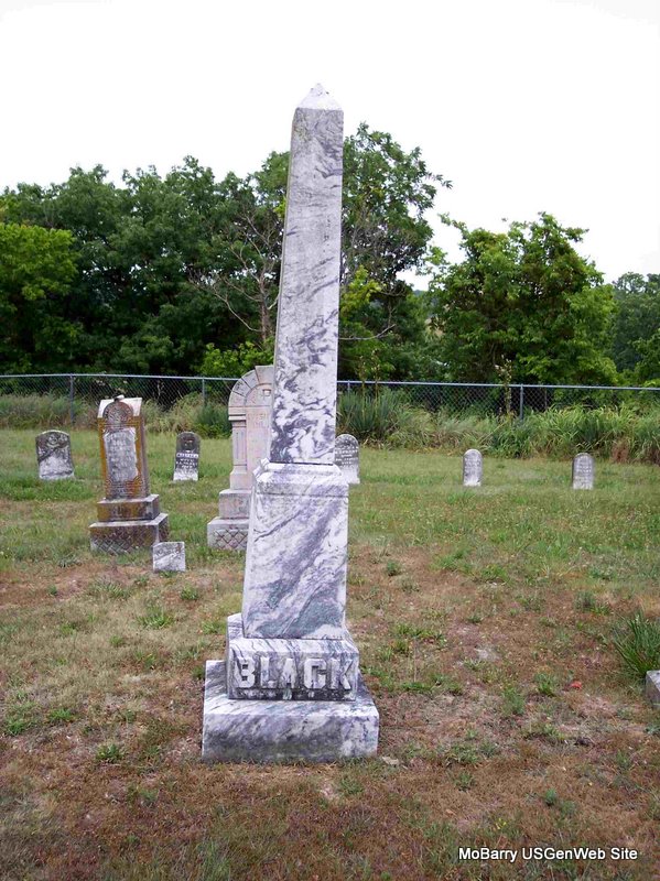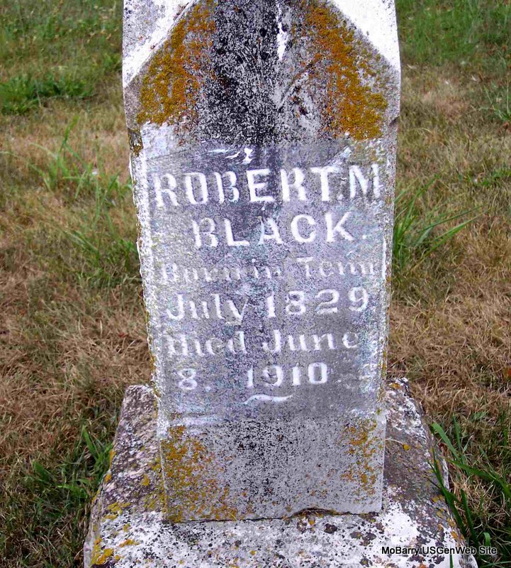 Inscription: "Born in Tennessee" - Research Note: Death Certificate reads that he was born July 29, 1832 in Tennessee, and was a son of William M. and Jane (Miller) Black. Robert Black married Mary Henley on Apr. 1, 1855 in Barry Co., MO. - Cassville Republican, June 16, 1910 - Old Citizen Gone: Robert M. Black died at his home northeast of Cassville Wednesday, June 8, 1910, of a complication of troubles, age 76 years. Until a few weeks ago "Uncle Robert" as he was familiarly called, had been in remarkably great health for a man of his age. He was often spoken of as one of the strongest old men in the country, continuing to do his own work. Robert Black had been a citizen of the county since 1852, coming here when a young man from Hamilton County, Tenn., where he was born and reared. He was another of this country's pioneers who has answered the call to the great unknown. He leaves a wife, two daughters, Mrs. Thomas Robberson, and Miss Ida Black, three brothers W. C. Taylor and J. M. and two sisters Mrs. Eliza Prentice of Garland, Okla., and Mrs. Houston Bradley of near Cassville. Funeral services were conducted Friday morning at the Pilant cemetery north of town by Rev. J. W. Ennes where his remains were laid to rest. | Headstone Bonnie Black Hankins Death Certificate Donna Cooper Online Obit MO Marriage Records Phyllis Long Photo Diana Cope |