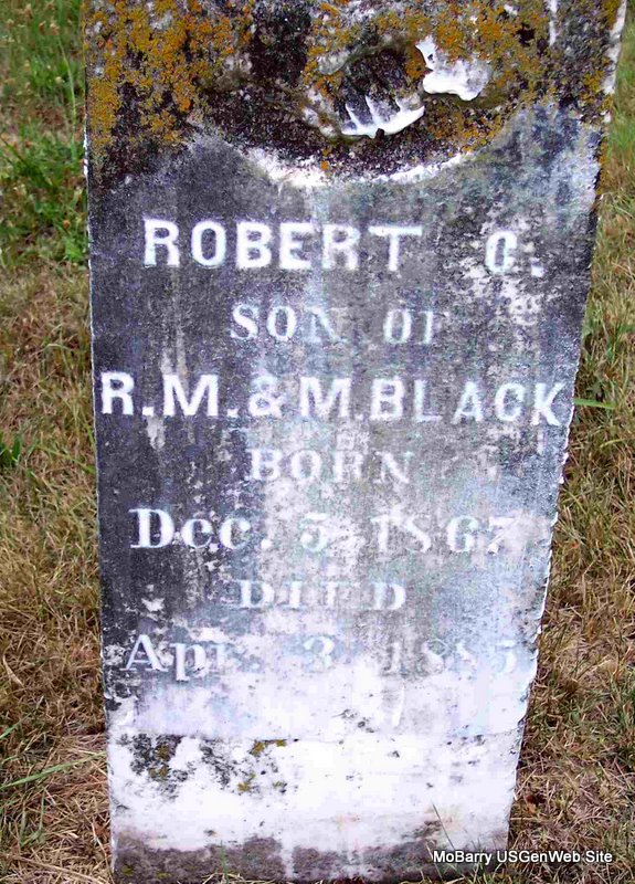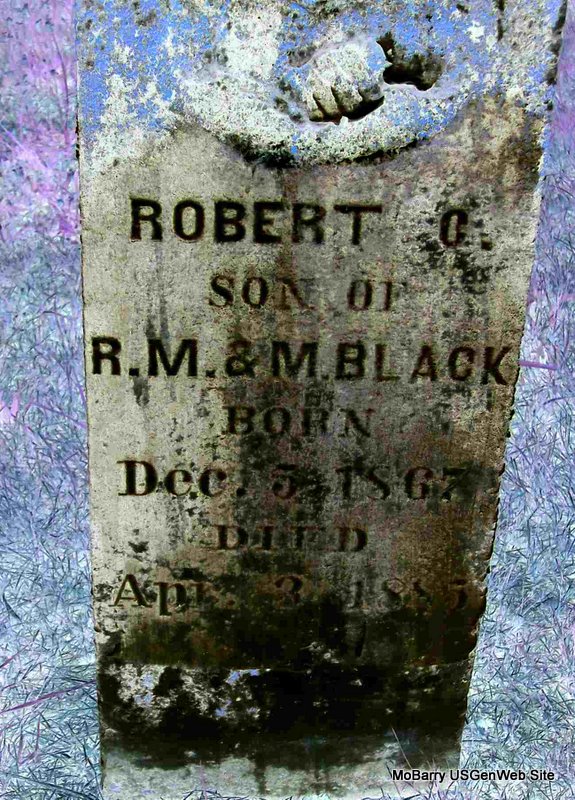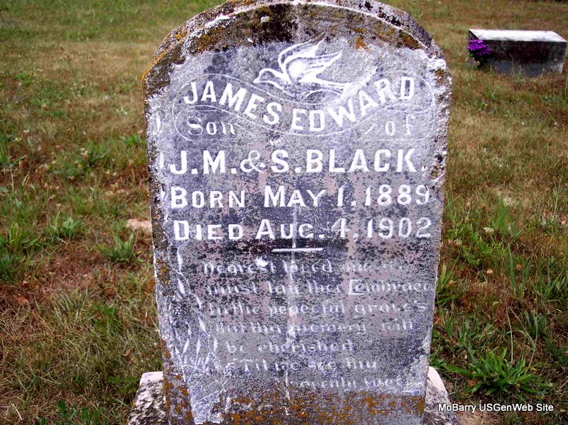| BLACK, James Edward | May 1, 1889 | Aug. 4, 1902 | Inscription: "Son of J. M. and S." - Research Note: Son of John Mack Black and Sophronia Ryan. | Note Phyllis Long Photo Diana Cope |