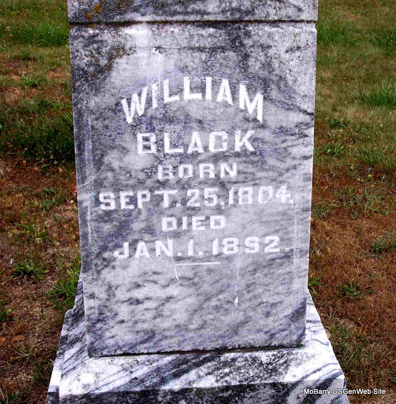 SSW: Jane S. - Research Note: Left TN between 1830 - 1840. Not known when he arrived in MO. Is on 1850 census. Wife: Jane S. Black. - William Black married Jane Miller on Mar. 4, 1830 in Jefferson Co., TN. - 1860 Census, Flat Creek Twp., Barry Co., MO - Wm Black, 55, Farmer, Tennessee, Male; Jane Black, 48, Domestic, Tennessee, Female; Wm C. Black, 23, Farmer, Alabama, Male; John Black, 20, Farmer, Alabama, Male Samuel Black, 18, Farmer, Tennessee, Male; Eliza Black, 14, Tennessee, Female; Taylor Black, 10, Tennessee, Male; Monroe Black, 8, Tennessee, Male; Margaret Black, 3, Missouri, Female; Julia Black, 12, Missouri, Female. - Full View of Stone | Headstone Note Bonnie Black Hankins Census TN Marriage Records Phyllis Long Photo Diana Cope |