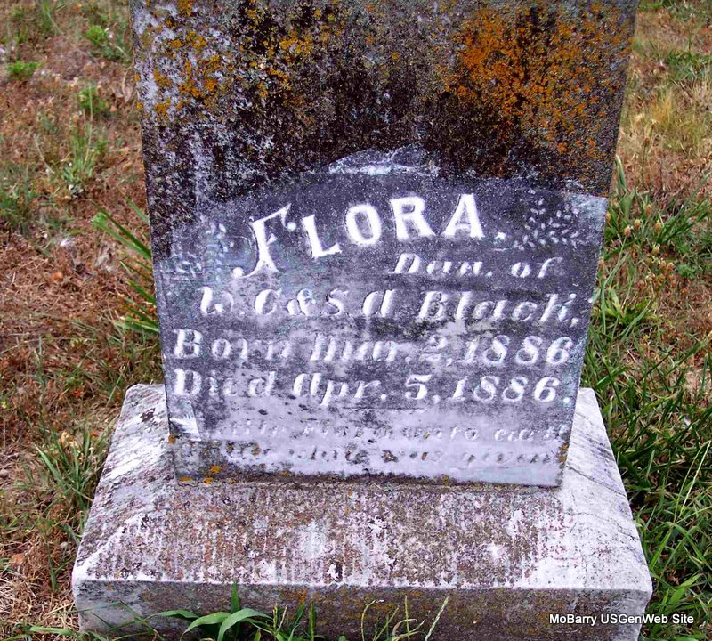 | BLACK, Flora | Mar. 2, 1886 | Apr. 5, 1886 | Inscription: "Dau. of W. C. and A." | Photo Diana Cope |