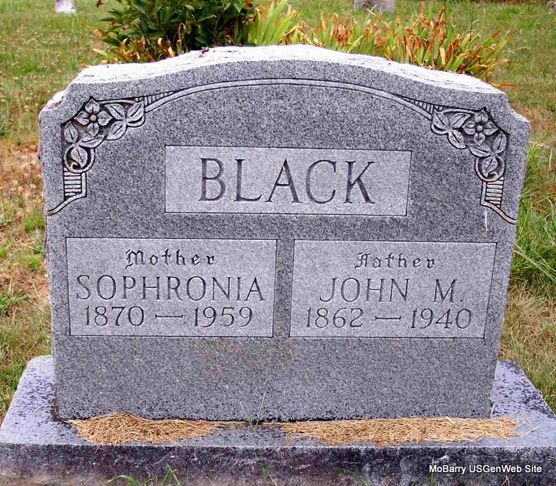 SSW: John M. - Inscription: "Mother" - Research Note: Daughter of George and Laura (Bell) Ryan. Wife of John M. Black. They had five children. Fred H. born 1890 - died 1894; James Edward, born 1889 died 1902. Albert, Marion Jacob, Luther lived to adulthood and married. Marion Black of Cassville, MO was the informant on the death certificate. - John M. Black married Sophronia Ryan on Nov. 20, 1887 in Barry Co., MO. | Headstone Note Bonnie Black Hankins Death Certificate MO Marriage Records Phyllis Long Photo Diana Cope |