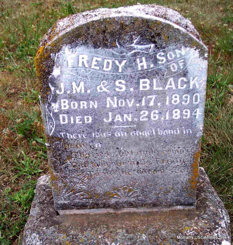 | BLACK, Fredy H. | Nov. 17, 1890 | Jan. 26, 1894 | Inscription: "Son of J. M. and S." - Research Note: Son of John Mack Black and Sophronia Ryan. | Note Phyllis Long Photo Diana Cope |