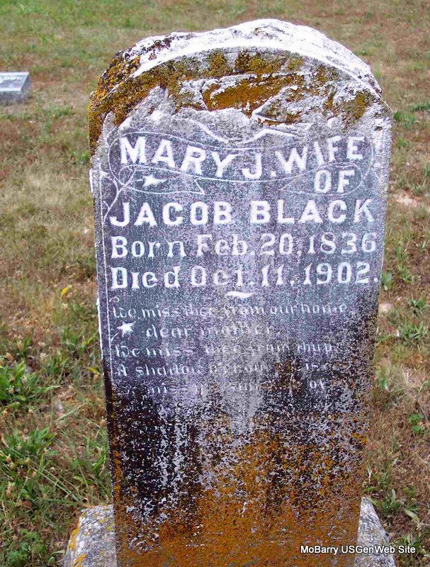 Research Note: Jacob was the first son of William M. Black and Jane Sellers Miller. His wife was Mary Jane Kirkpatrick. His headstone is reported to be a victim of vandalism. At one time several headstones were thrown over the cliff into Flat Creek. - November 23, 1899, Cassville Republican - Black News: The orphan boys from Eureka by the name of Combs have secured good homes in this neighborhood. One at Jake Black's, one at James Turner's and one at Epsey Burk's. - 1860 Census, Flat Creek Twp., Barry Co., MO - Jacob Black, 26, Farmer, Tennessee, Male; Mary J. Black, 24, Domestic, Kentucky, Female; Eliza J. Black, 1, Missouri, Female. | Headstone Note Bonnie Black Hankins Online Newspapers Census Phyllis Long |