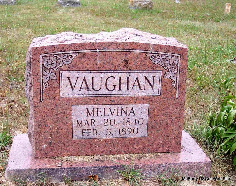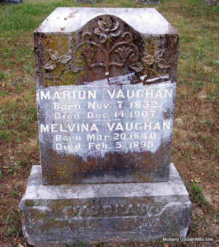 SSW: Melvina - Research Note: Civil War Veteran: Pvt. Co., G, 31 MO Inf. Served from Aug. 14, 1862 to June 16, 1865. Son of Sterling Vaughan and Nancy Brawner. Marion Vaughan, age 58, second married Elizabeth McArtor, age 46, on Sept. 30, 1893 in Barry Co., MO. - Cassville Republican, Barry Co., MO, Thursday, Jan. 11, 1894 - A Narrow Escape: Three or four days since, a mare owned by Marion Vaughan got caught by rolling against the straw-stack. Mr. Vaughan took hold of her feet to roll her over, when a playful colt, two years old, ran up and gave him a kick that sent him skyward onto a wing of the stack. He slid back on to the feet of the mare, who gave him another boost with her feet and sent him out of reach of further danger. He got up very sore, but thankful for his life. - April 5, 1894, Thursday, Cassville Republican - There was but little interest in the horse show Monday, but five horses being shown. They were W. H. Brown's Prince, Marion Vaughan's Ned, C. D. Manley's Charley, E.W. Hawk's Boston and Geo. Clark's roan. - November 12, 1904, Saturday, Cassville Democrat - The children of Marion Vaughan of near the Black schoolhouse, celebrated his 74th birthday, Nov. 7, by gathering at their father's home and partaking of a splendidly prepared dinner, that was enjoyed by all present. We wish him many more such occasions. | Headstone Janice Vaughan 1890 Vet Census MO Marriage Records Online Newspapers Phyllis Long Photo Diana Cope |