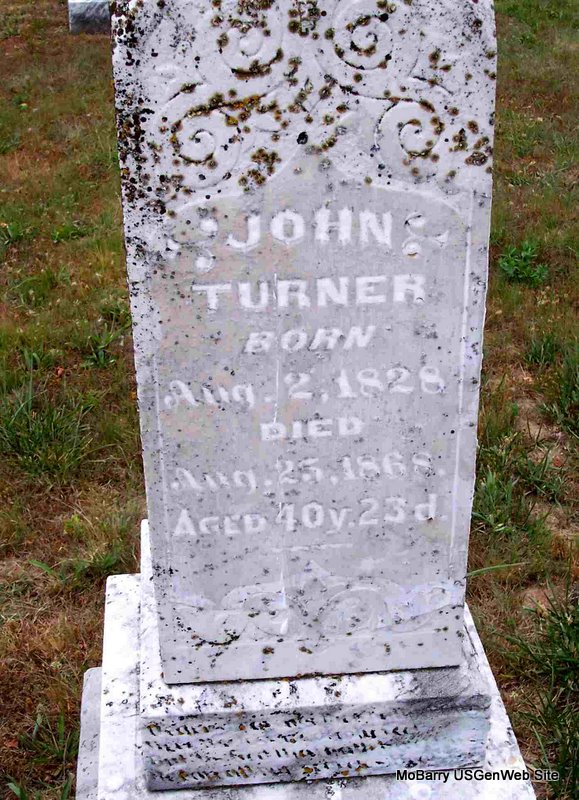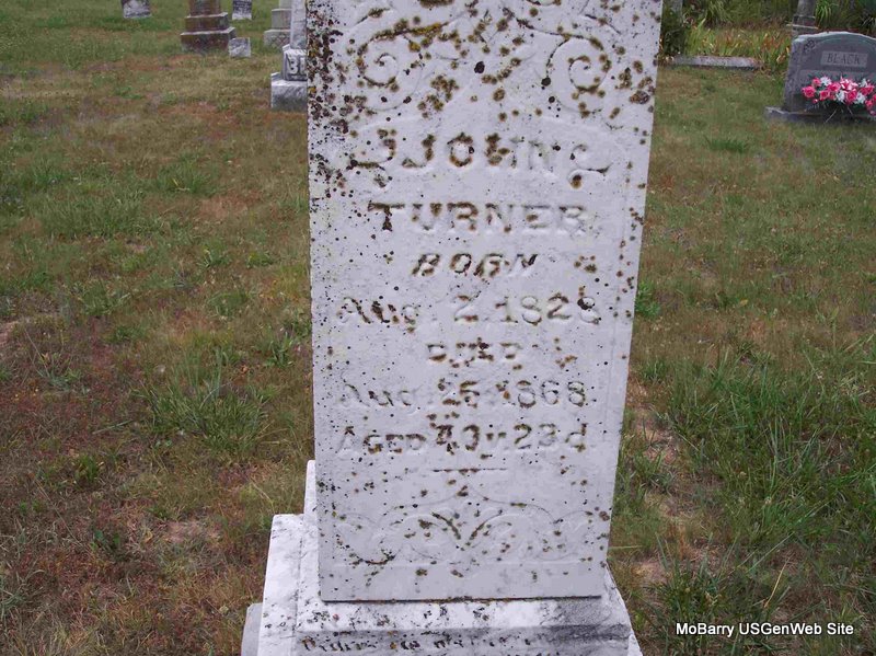 Aug. 25, 1868 | Inscription: "Aged 40 y 23 d" - Research Note: Researchers say he was the son of John Middleton Turner and Anna Nancy Cantrell. His wife was Elizabeth Dixon. - Another Photo - Another View - Another View | Note Phyllis Long Photo Diana Cope |
