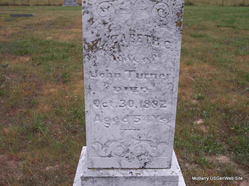 Oct. 30, 1882 | Inscription: "Wife of John Turner - Aged 54 years" - Research Note: John Turner married Elizabeth Dixon on July 9, 1850 in Cherokee Co., GA. Researchers say she was the daughter of John Dixon and Fereby Woodham. - Another Photo - Another View - Another View | GA Marriage Index Phyllis Long Photo Diana Cope |