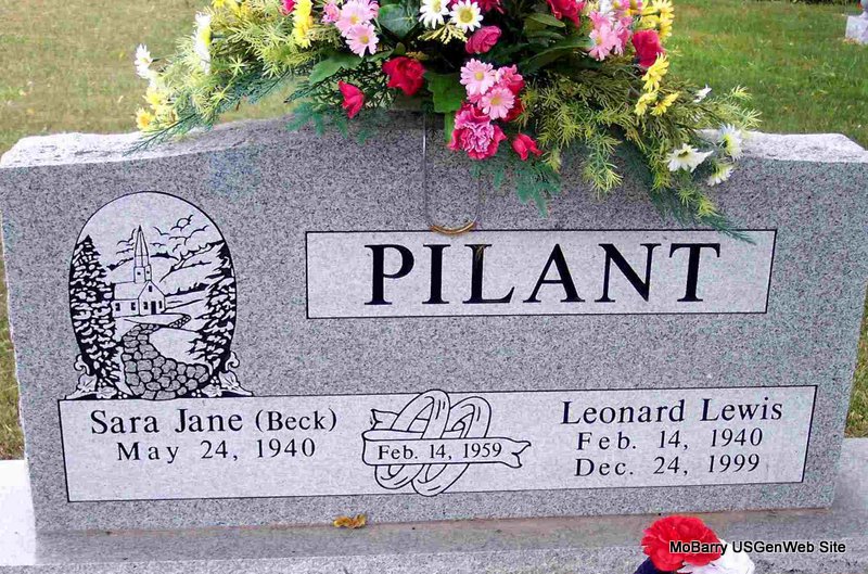 SSW: Leonard Lewis - Inscription: "Married Feb. 14, 1959" - Research Note: She was the daughter of Virgil and Dorothy (Johnson) Beck. She grew up in Cassville, and graduated from Exeter High School. Sara was united in marriage to Leonard Pilant on February 14, 1959 at New Hope Baptist Church. They made their home in Fayetteville, Ark., Anchorage, Ala. and then in Lincoln for the past 40 years, where they owned and operated the Radio Shack in Clinton and the Sara-Len Western Store in Lincoln. She was preceded in death by her parents; her husband, Leonard Pilant in 1999; her brothers-in-law, Howard Pilant, of Sedalia, and Charles Thompson, of Cassville. | Barry Co. Advertiser Phyllis Long Photo Diana Cope |