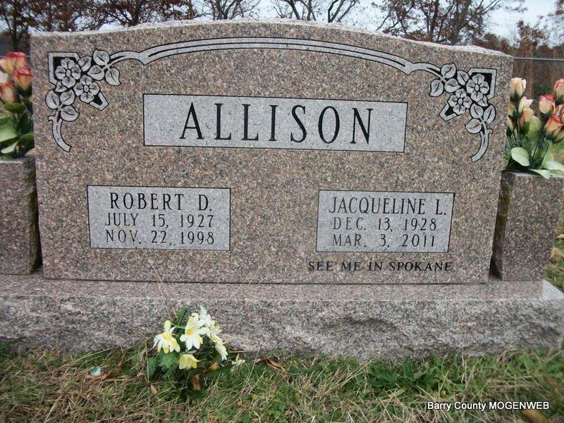 SSW: Robert D. - Inscription: "See Me In Spokane" - Research Note: NOT BURIED HERE, unless the obit is wrong. - Robert Allison married Jacqueline Hilderbrand on Dec. 3, 1948 in Jefferson Co., OR, who was a daughter of Dennis Daniel Hilderbrand and Lillian "Hevowah" Falkner. She and her parents were listed on the U.S., Indian Census Rolls, 1885-1940. Apparently wrote her own obit. - The trail was long and it came to an end on March 3, 2011, at 12:15 a.m. There was "My Bob" standing there with the Lord to greet me. My journey began on Dec. 13, 1928, as the first-born to Lillian and Dennis Hilderbrand in the first hospital built in Fort Defiance, Arizona on the Navaho Indian Reservation. My wanderings had me living in Arizona, Idaho, Texas, and then in Oregon, where Bob and I met and wed. We lived, worked and retired in Long Beach, Calif., and then moved to Cassville in 1983. My working years started in the late 1950s as a medical receptionist for a private practice in Long Beach, Calif., and ended with H and R Block in Cassville in the spring of 2003. Special thanks for the care she received at the Waterford on the South Hill, Sacred Heart Medical Center, to all the wonderful doctors, and their personnel who attended to her these past seven years. A "Celebration of Life" will be held March 10 at noon at Riplinger Funeral Home, 4305 N. Division, Spokane, Wash., followed by interment at Spokane Memorial Gardens Cemetery, Spokane/Cheney Rd. - Another Photo | OR Marriage Records Census Obit Phyllis Long Photo Diana Cope |