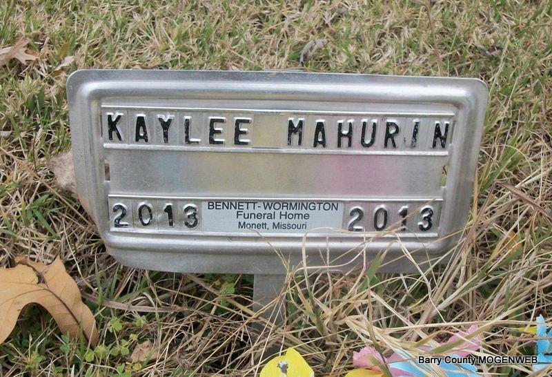 Research Note: Kaylee Mahurin, stillborn daughter of Kevin and Stephanie Mahurin of Monett, MO, passed away on Thursday January 17, 2013 at 1:12 p.m. at Freeman Hospital in Joplin, Missouri. She is survived by both her parents; two brothers; paternal grandmother; and maternal grandmother. She was preceded in death by her paternal grandfather: Loren Mahurin and maternal grandfather: Robert Rynders. | Bennett-Wormington Funeral Home Phyllis Long Photo Diana Cope |
