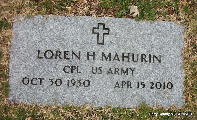 SSW: Wilma L. - "Married July 23, 1955" - Research Note: Purdy resident. He was a son of Alvie and Mabel (Lombard) Mahurin. He was united in marriage to Wilma Wormington of Purdy July 23, 1955. Loren worked at the Gillioz Theater until he was drafted by the US Army to the Korean War and served two years. When he returned home he worked for Jumping Jack Shoes in Monett. When he retired he had 50 years of service to Jumping Jack Shoes. Loren was preceded in death by his parents, one brother Wayne, one sister Ora Thurman. - Military Stone - Inscription: "CPL US ARMY" | Bennett-Wormington Funeral Home Phyllis Long Photo Diana Cope |