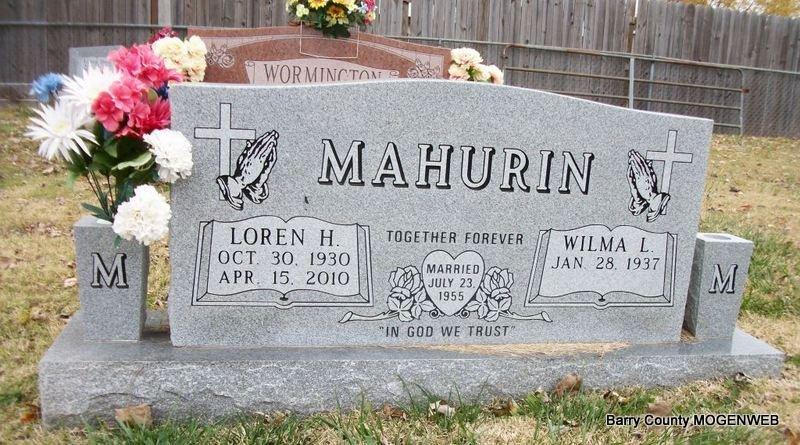 SSW: Loren H. - Inscription: "Married July 23, 1955" - Research Note: Mother's maiden name was Henderson on the birth record. - Daughter of Damon Cecil Wormington and Olive Lovena Henderson, both buried at Purdy Cemetery. She was united in marriage to Loren Mahurin on July 23, 1955, who preceded her in death April 10, 2010. Lou was a homemaker and worked many years as a hairstylist at her beauty shop, Wilma's Beauty Shop in Purdy. Lou was preceded in death by her parents, two brothers: Lavon and Charles Wormington and one sister: Maxine Quick. | CA Birth Index Census Bennett-Wormington Funeral Home Phyllis Long Photo Diana Cope |
