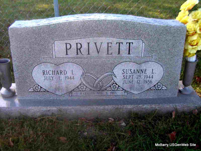 SSW: Susanne Lynn - Inscription: "Married Nov. 3, 1963" - Research Note: Shell Knob, Barry Co., MO resident. He was the son of Willard and Lydia (McQuire) Privett. He graduated from West Point High School in Nebraska and subsequently married Susanne Nelson in 1963; she preceded him in death in 1986. Mr. Privett moved to Cassville in 1974 where he married Janice Snider on August 28, 1987. He worked at Fasco for several years until his retirement in 1997. In addition to his parents, he was preceded in death by three brothers, Ralph Privett, James Privett and Dallas Privett; his granddaughter, Madyson Privett; and his sister-in-law, Linda Privett. Service arrangements and cremation are under the direction of the White Funeral Home and Crematory, Cassville, Missouri. | White Funeral Home Phyllis Long Photo Jay Trace |