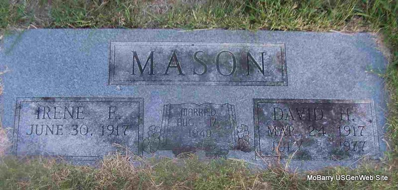 | MASON, David H. | Mar. 24, 1917 | July 3, 1977 | SSW: Irene E. - Inscription: "Married Aug. 17, 1940" - Research Note: Son of Charles Ransom Mason and Mary Dosha Evans. | Census Phyllis Long Photo Jay Trace |