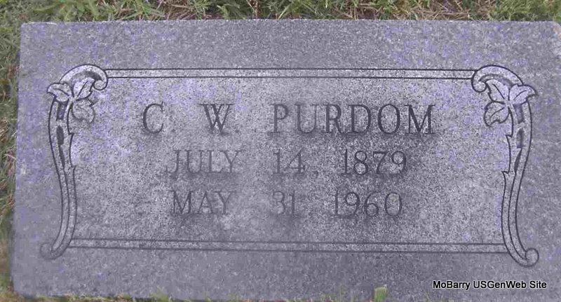 Research Note: Monett Times reads that he was born July 14, 1881 and not 1879 as the stone reads. Death certificate also has 1881. Son of William Purdom and Elizabeth Johns. His wife was Gertrude "Gertie" Stump. His second wife was Allie B. Blythe, died Feb. 8, 1960 and is buried at Clio Cemetery. | Death Certificate Phyllis Long Photo Obit Jay Trace |