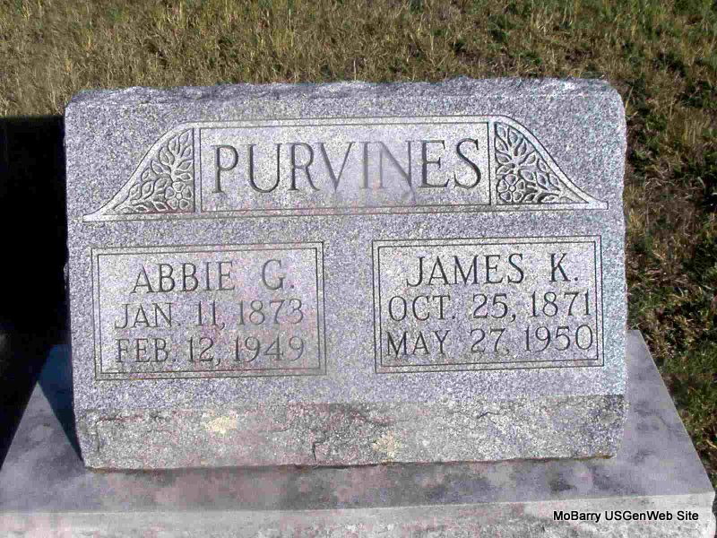 SSW: Abbie G. - Research Note: His death certificate is indexed as Jack K. Purvines. His father was J. K. Purvines, Sr., and his mother was Julia Marshall. His wife was given as Abbie Gill Purvines and he was widowed. He was a farmer and a stockman. Otis Kackley of Purdy gave the information. - James K. Purvines married at age 21, Leva A. Smith, age 18, on Mar. 23, 1893 in Barry Co., MO. Married to Abbie in the 1910 census. | Death Certificate Donna Cooper MO Marriage Records Phyllis Long Photo Jay Trace |
