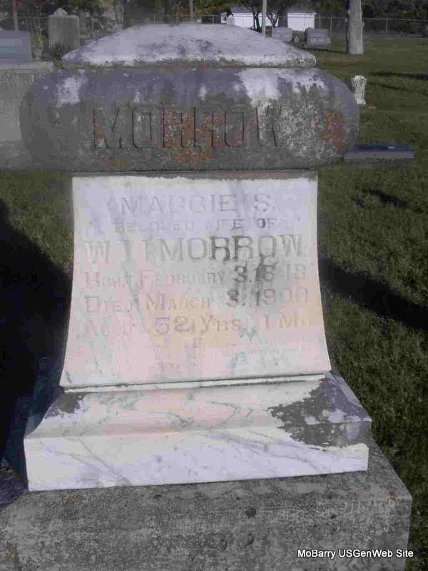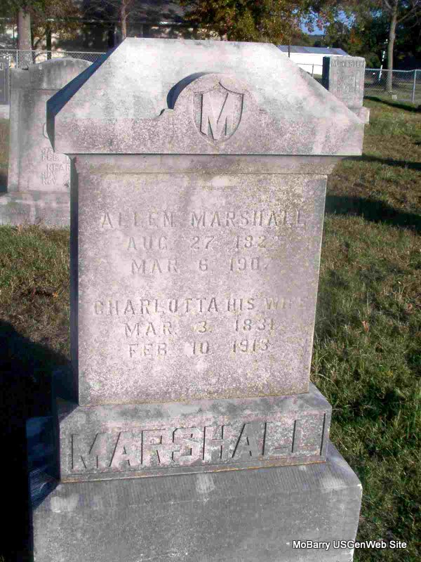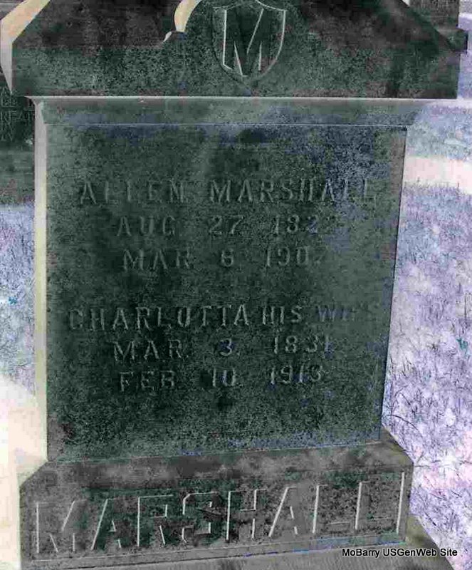 SSW: Charlotta - Research Note: Civil War Veteran, Pvt. Co. H, 7th MO Cav. - March 9, 1907, Saturday, Cassville Democrat - Allen Marshall an old time citizen of this county, died Wednesday at his home 3 miles east of Purdy on Little Flat Creek, age 84 years. He had reared a large family, and was well and favorably known to the older citizens. - Cassville Republican, Thursday, June 20, 1901 - Purdy News: Wednesday, June 19, was the 53rd anniversary of Mr. and Mrs. Allen Marshall, parents of Mrs. W. I. I. Morrow, and in order to commemorate the same, Mrs. Morrow planned a surprise dinner on the old folks. The surprise was complete but the dinner was the best part of all. Those present were Rev. Smith, Mr. and Mrs. Willis, Mrs. J. H. Lowery, Mrs. Morrow, Misses Effie Burris and Frona Morrow. - Daughter's Obit - Computer Enhanced Negative | Online Newspapers 1890 Vet Census Phyllis Long Photo Jay Trace |