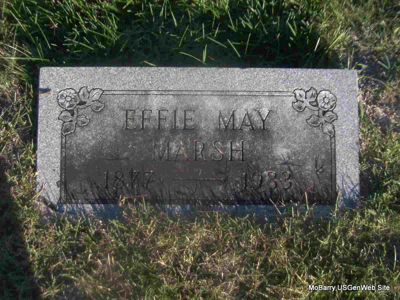 Research Note: She's buried near the Stinnett family. Wife of Rufus H. Marsh. Daughter of John R. Stinnett and Martha E. Waltrip, both born Barry Co., MO. Mrs. Alice Douglas of Wheaton, MO was the informant on the death certificate. - Joplin Globe, Nov. 14, 1933 - Mrs. Effle May Marsh, 56 years old, 1712 Moffet avenue, Jasper county resident twelve years, died at 4 o'clock yesterday afternoon at the home of a sister, Mrs. Anna Proctor, 2612 Connor avenue. She had been ill for the last several weeks, and was removed from her home to her sister's home yesterday morning in a Lanpher ambulance. She was born May 6, 1877, in Purdy, Mo., and was a member of the Methodist Episcopal church there. She moved here three years ago from Carthage. Surviving, besides her sister at whose home she died, are her husband, Rufus H. Marsh; two sons Virgil M. Stinnett of Joplin and LeRoy Marsh of Dallas, Tex.; a brother, William R. Stinnett of Los Angeles,and two other sisters, Mrs. Alice Douglass of Wheaton and Mrs. Emma England of Riverside, Calif. Funeral services have tentatively been scheduled for 2 o'clock tomorrow afternoon at the Lanpher chapel. The Rev. E. W. Love will be In charge. Burial Purdy Cemetery. | Death Certificate Joplin Globe Phyllis Long Photo Jay Trace |