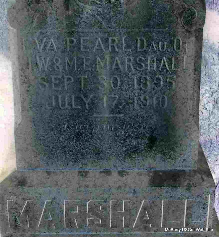 Inscription: "Dau. of J. W. and M. E." - Research Note: Daughter of James William Marshall and Mary Elizabeth Henderson. - July 21, 1910, Thursday, Cassville Republican - Eva Pearl, daughter of Mr. and Mrs. J. W. Marshall, died Sunday, July the 17, after a lingering illness of typhoid fever, age 15 years, 9 months, and 17 days. - Computer Enhanced Negative | Online Newspapers Phyllis Long Photo Jay Trace |