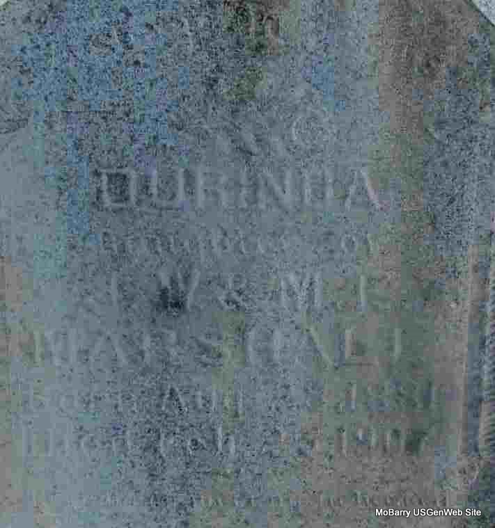 | MARSHALL, Durinda | Aug. 28, 1881 | July 25, 1907 | Inscription: "Dau. of J. W. and M. E." - Research Note: Her footstone has "R" on it, middle initial. Daughter of James William Marshall and Mary Elizabeth Henderson. - Computer Enhanced Negative | Note Phyllis Long Photo Jay Trace |