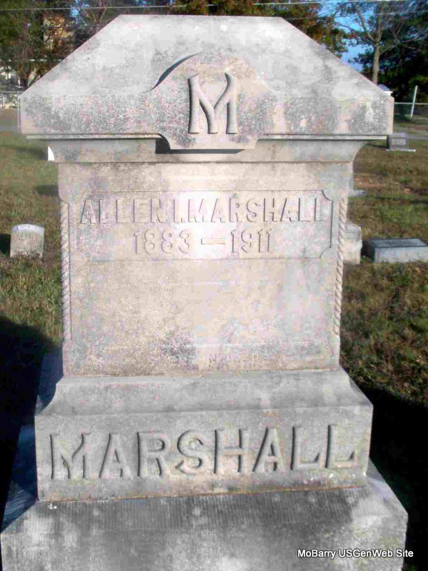Research Note: His death certificate states that his father was William Henderson Marshall and that his mother's name was Mary Rowena Fly. His wife was May Zoah (Smith) (Marshall) Campbell. - Cassville Republican, Feb. 16, 1911 - On Friday night, Feb. 10, the death angel visited our community and snatched from our midst Allen Marshall after a short illness of pneumonia fever. Allen Irvin Marshall was born Jan. 9, 1883, died Feb. 10, 1911, aged 28 years, 1 month and 1 day, was converted at the age of 21 and lived a devoted Christian life. Allen lived a life that should be an example to anyone. Funeral services were held at his father's home Sunday, Feb. 12, conducted by Rev. G. W. Quails, after which the remains were laid to rest in the Purdy Cemetery. He leaves to mourn his loss a darling baby boy two weeks old, a loving wife, a father, mother, three sisters, three brothers, and a host of friends and relatives. | Death Certificate Online Obit Donna Cooper Census Phyllis Long Photo Jay Trace |