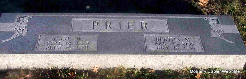 | PRIER, Carl W. | Sept. 14, 1903 | June 2, 1988 | SSW: Bertha M. - Research Note: Son of John Wesley Prier and Caroline Minerva Riddle. | Census Phyllis Long Photo Jay Trace |