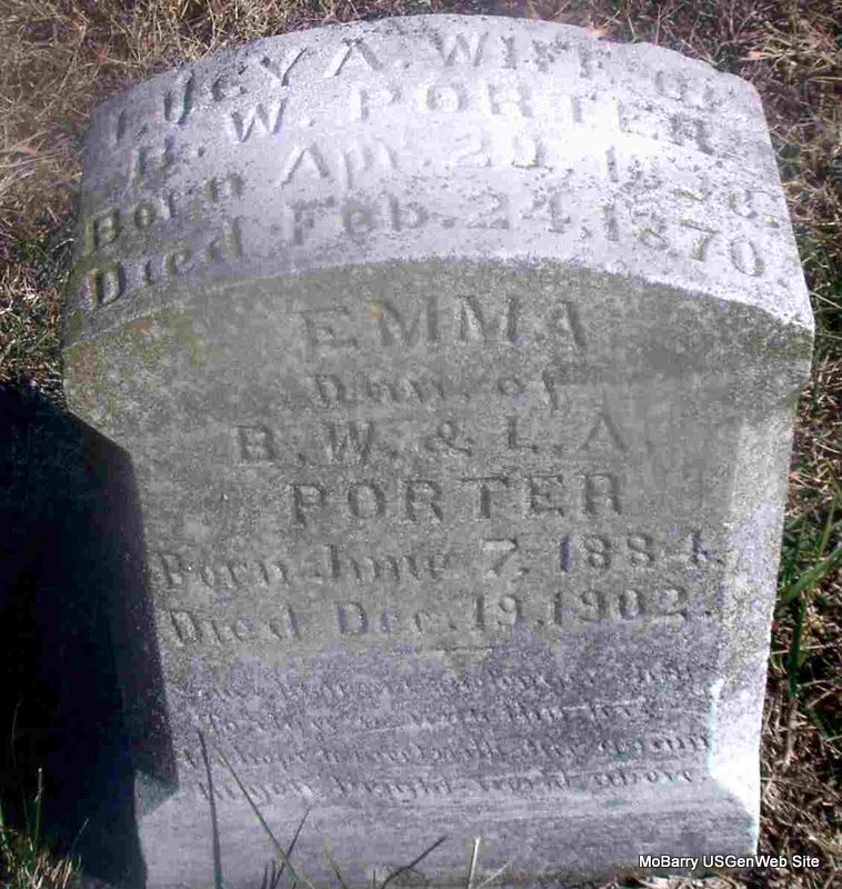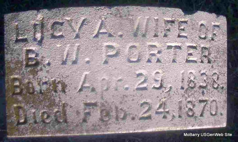 | PORTER, Lucy A. (DAVIS) | Apr. 29, 1838 | Feb. 24, 1870 | SSW: Emma - Inscription: "Wife of B. W. Porter" - Research Note: Daughter of Reuben H. Davis and Elizabeth Owens. First wife of Barry W. Porter. B. W. Porter first married Lucy Davis on Nov. 11, 1872 in Greene Co., MO. Barry is buried at Creason Cemetery. - Another Photo | Census MO Marriage Records Phyllis Long Photo Jay Trace |