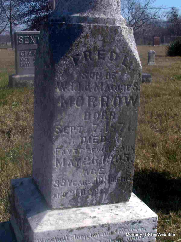Research Note: Death certificate gives his birth year as 1871. He was a retired blacksmith. Son of John Murphy Marlow born NC and Rachael Carolyn Hill born GA. His wife was Nora Isabelle Utter. She died in 1970 and is buried at Lakewood Memorial Park, Hughson, Stanislaus Co., CA. - Might be for John M. - Cassville Republican, Thursday, March 28, 1918 - John Marlow northeast of Cassville on Flat Creek has bought a blacksmith shop at Butterfield and will move there. | Death Certificate Online Newspapers Phyllis Long Photo Jay Trace |