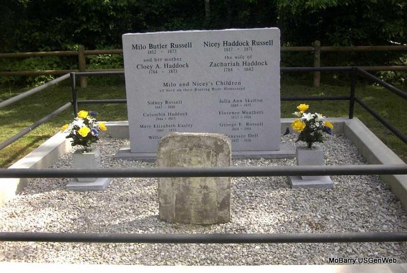 October 2001: Russell and Haddock descendants of Milo and Nicey went together to buy a new large granite headstone as the old one can't be read now. This photo shows that the old marker is still there in front of the new one. Chloe Albritton Haddock (Nicey's Mother) was also buried here, her information is on the stone along with her husband Zachariah Haddock who was buried in an unmarked grave in the "Old Haddock" Cemetery at Eagle Rock, Mo. Milo and Nicey Russell's children's names and birth years are on the front of the stone. On the back are the names of all their 49 grandchildren & 227 great grandchildren.