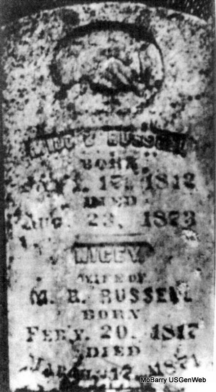 20, 1817 in Knox Co., KY d: March 18, 1870 in Barry Co., Missouri Burial: Russell farm, Roaring River State Park, Barry County, MO +Milo Butler Russell b: January 17, 1812 in Ashtabula, Ashtabula County, OH m: July 07, 1841 in Barry Co., Missouri d: August 23, 1873 in Barry Co., Missouri Burial: Russell farm, Roaring River State Park, Barry County, MO