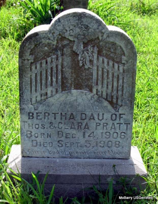 | PRATT, Bertha | Dec. 14, 1906 | Sept. 5, 1908 | Inscription: "Dau. of Thos. and Clara Pratt" | Photo Jack Fly |