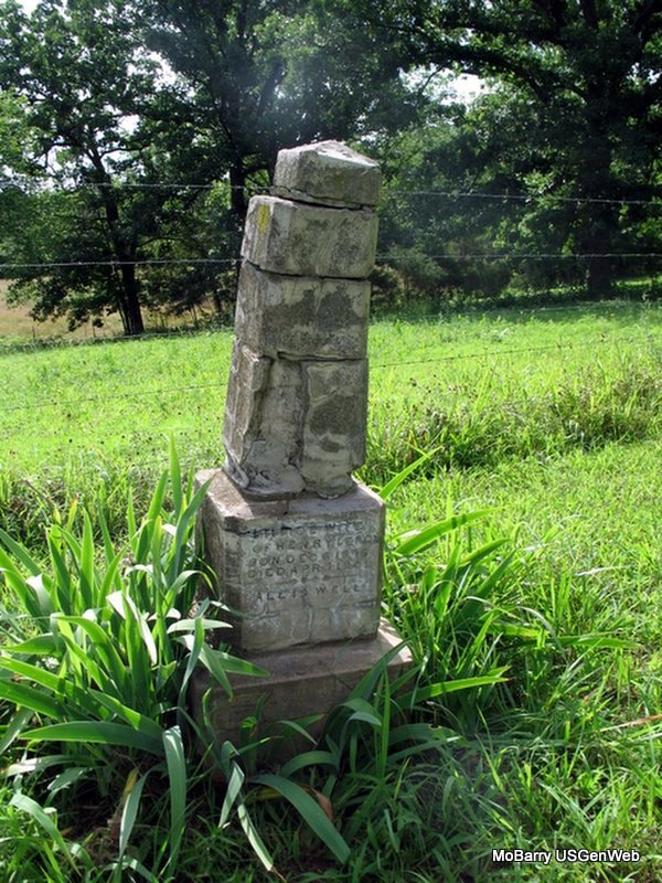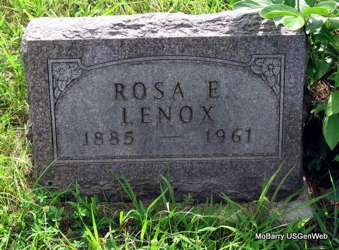 Inscription: "Lillie Wife of Henry Lenox - All is Well" - Research Note: According to the Barry County newspapers they married Jan. of 1893 in Barry Co., MO. They are listed in the Barry Co., marriage records with marriage date Jan. 8, 1893. Lillie E. Reed was age 16 and Henry R. Lenox was age 23. - Daughter of Martha Hurd who married Thomas William Reed about 1879. In the 1880 Census, Martha, age 26, is living with her parents, William and Eliza Hurd, with Lillie Hurd, age 4, and Creed Hurd, age 1. These 2 children apparently took the name Reed which agrees with the later census records. Henry Richard Lenox, age 23, married Lillie E. Reed, age 17, on Jan. 8, 1893 in Seligman, Barry Co., MO. Her parents gave consent, not named on the marriage record. Henry second married Maggie Ramsey on Feb. 2, 1905 in Carroll Co., AR. They moved to Skagit Co., WA and he died there. He was a son of Spencer and Caldonia Lenox. - Another Photo | MO Marriage Records Census Phyllis Long Online Newspapers Donna Cooper Photo Jack Fly |