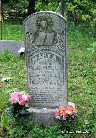 Sept. 28, 1888 | Inscription: "Wife of S. C. Hill" - Research Note: Wife of Simeon "Sid" Hill. Researchers say she was the daughter of Thomas Willoughby and Elizabeth Hall. | Note Headstone Ruby M. Ruark Snow Photo Jack Fly |