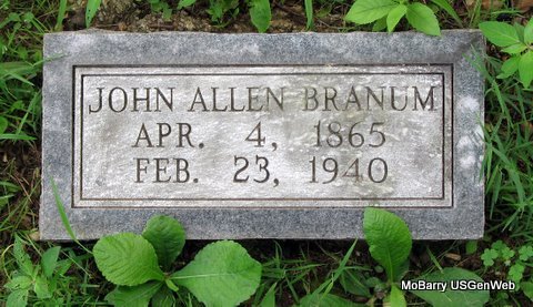 Research Note: His wife was Rosa Jane Toy. Son of John Branum and Millie Henley. Fred Branum of Washburn, MO was the informant on the death certificate. Note at findagrave.com says John Branum was his father and his mother's name was Permellia Amelia "Millie" Heminger. | Headstone Ruby M. Ruark Snow Death Certificate Phyllis Long Donna Cooper Photo Jack Fly |