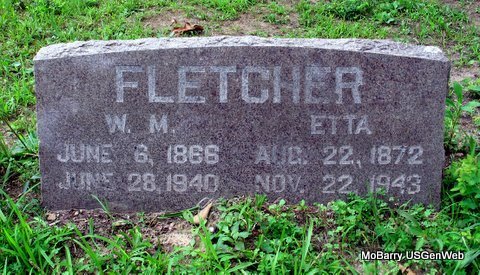 SSW: William Melvin Fletcher - Research Note: Daughter of Simon C. Hill born Jackson Co., WI and Mary Ann Willoughby born St. Joseph, MO. Howard Fletcher, son, was the informant on the death certificate. It gives her birth year as 1870. - 1910 Census, Ash Twp., Barry Co., MO - Melvin W. Fletcher Male 50 Married White Head 1860 Wisconsin Vermont United States; Etta Fletcher Female 37 Married White Wife 1873 Wisconsin Ohio Indiana; Percy Fletcher Male 21 Single White Son 1889 Missouri Wisconsin Wisconsin; Nettie Fletcher Female 15 Single White Daughter 1895 Missouri Wisconsin Wisconsin; Liddie Fletcher Male 12 Single White Son 1898 Missouri Wisconsin Wisconsin; Donald Fletcher Male 9 Single White Son 1901 Missouri Wisconsin Wisconsin; Marvin Fletcher Male 7 Single White Son 1903 Missouri Wisconsin Wisconsin; Virgil Fletcher Male 5 Single White Son 1905 Missouri Wisconsin Wisconsin; Howard Fletcher Male 1 Single White Son 1909 Missouri Wisconsin Wisconsin; Simeon Hill Male 77 Widowed White Father-in-law 1833 Ohio New York Ohio. | Headstone Ruby M. Ruark Snow Death Certificate Census Phyllis Long Donna Cooper Photo Jack Fly |