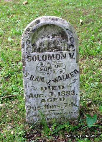 | WALKER, Solomon V. | Abt. 1871 | Aug. 3, 1882 | Inscription: "9 yrs, 11 ms, 7 ds - Son of S. B. and M. J." - Research Note: Son of Steven Bedford Walker and his wife Mary Jane Tuck. - Another one of their children was Sarah Ada Walker who married James Campbell Pippin and they are buried at King's - just down the road. - Walker Family | Note Donna Cooper Photo Jack Fly |