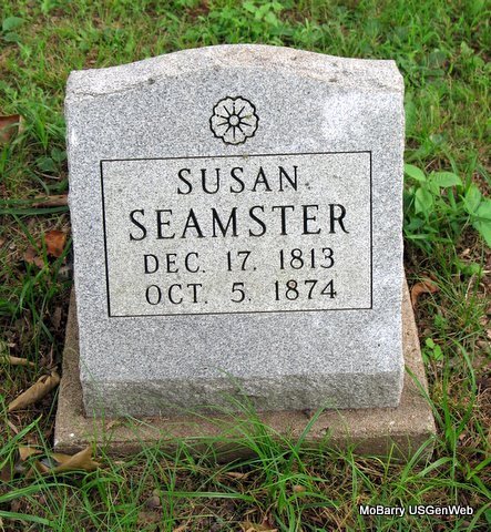 Oct. 5, 1874 | Research Note: First wife of Rev. William Seamster. Researchers say she was the daughter of John Rigsby and Elizabeth Howard. Susan Rigsby married William Seamster on Feb. 3, 1836 in Allen Co., KY. - Susan Wright Rigsby Seamster was born in the state of Kentucky, near Green, Allen County Dec. 19 1913. She was married to Rev. Williamson Seamster in KY on Feb. 11, 1836. She immigrated to MO an died at Rocks Springs, MO. She was a member of the Baptist Church 33 years and was baptized the same day as her husband. She reared 15 children and lived to witness the conversion of them all, 14 of whom have become members of the church. She has now gone to reward from her labors, and wait the arrival of her husband and children. Sister Seamster told her husband she must go, that her way was clear. All her regrets was leaving her husband and children. She exclaimed with joy, "My departure is at hand, I have fought a good fight, I have kept the faith, I am going home to receive my Crown of Glory." Although, we mourn her passing, our loss is Heavens gain, she departed this life, Oct. 5 1874, a worthy member of the Rock Springs Baptist Church, where her body lies just before the door, beneath the little mound which is a memorial of her Christian Life Tranquill death and her Eternal Joy, around the throne of God where we desire to meet her by and by. - Written by Order of the Rock Springs Church where her husband is Pastor. | Headstone Cindy Marcell Note Ruby M. Ruark Snow Obit KY Marriage Records Phyllis Long Photo Jack Fly |