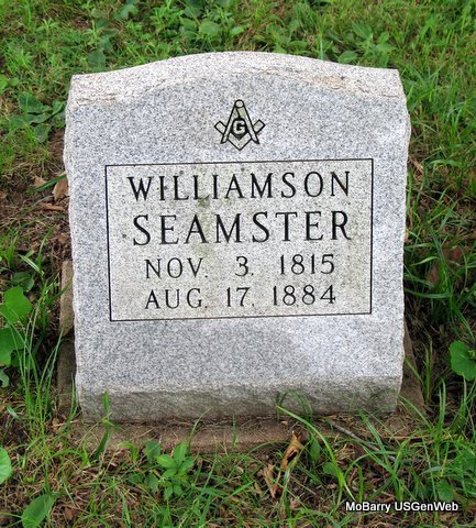 Research Note: Williamson was the first minister at Rock Springs. His affiliation as a Mason is inscribed on both his original and replacement headstone. The original headstones for Williamson and Susan are broken in half and replacements are next to the originals. He first married Susan Right Rigsby in 1836 in KY. - Susan Rigsby married William Seamster on Feb. 3, 1836 in Allen Co., KY. - William Seamster second married Mary Ann Pendergraft on Aug. 3, 1975 in Barry Co., MO. - Researchers say he was the son of John William Seamster and Sarah LeGrande Seamster. - September 23, 1915, Thursday, Cassville Republican - Rock Springs News: All of ten living children of the late Wm. Seamster had a family reunion at Rock Springs last Saturday and Sunday. The members of the Seamster family present were: Steven Seamster age 73; F. M.; Martin; Bethewell; Robert; Isaiah; Amanda Campbell; Ellen Atwood; Julia Hedrick and Nancy Jemerson, making the ten children. A number of the grandchildren were also present The memorial service was preached at the church at 11 O'clock, Sunday, conducted by Rev. F. M. Seamster of Avoca, Ark. They stated that they were coming back again. - Rock Springs Church | Note Headstone Cindy Marcell Ruby M. Ruark Snow US Marriage Records MO Marriage Records KY Marriage Records Online Newspapers Phyllis Long Photo Jack Fly |