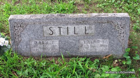 SSW: Mary E. - Research Note: William was a son of James A. and Susan M. (Davis) Still. Stone has no death date. Anthony Still of Exeter, MO was the informant on the death certificate. William Still, age 33, married Mary Roberts, age 23, on Mar. 16, 1899 in Seligman, Barry Co., MO. | Death Certificate MO Marriage Records Phyllis Long Photo Jack Fly |