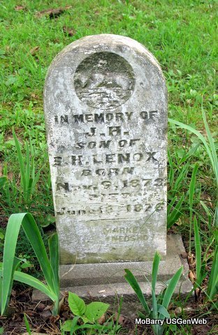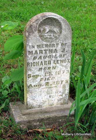 | LENOX, Martha J. | Sept. 19, 1873 | Aug. 2, 1875 | Inscription: "Dau. of Richard Lenox" - Research Note: Daughter of Richard and Nancy Lenox. Richard was a brother to Spencer Harrison Lenox. - January 18, 1912, Thursday, Cassville Republican - Sunnyside News: Richard Lenox from Decatur, Ark., has been visiting relatives S. H. Lenox and J. C. Pippin. | Note Headstone Ruby M. Ruark Snow Online Newspapers Phyllis Long Photo Jack Fly |