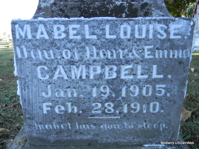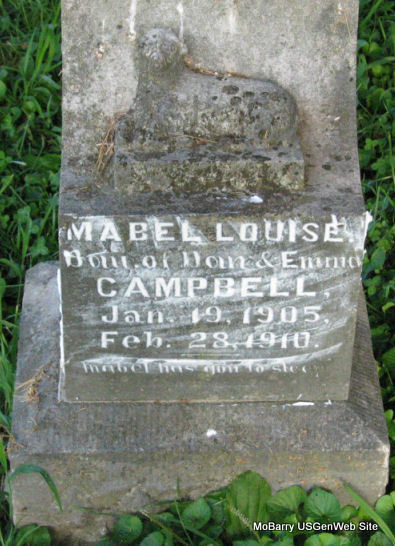 | CAMPBELL, Mabel Louise | Jan. 19, 1905 | Feb. 28, 1910 | Inscription: "Dau. of Don and Emma Campbell" - Another Photo - Another Photo | Photo Cheryl Photos Bill Utter |