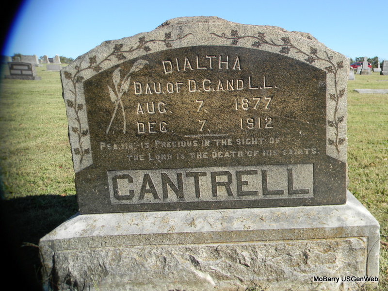 | CANTRELL, Dialtha | Aug. 7, 1877 | Dec. 7, 1912 | Inscription: "Dau. of D. C. and L. L." - Research Note: Daughter of David and Lucy Cantrell. | Census Phyllis Long Photo Bill Utter |