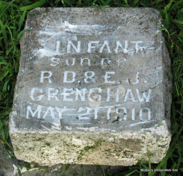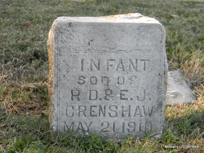 | CRENSHAW, Infant | No Date | May 21, 1910 | Inscription: "Infant son of R. D. and E. J. Crenshaw" - Research Note: This stone has one date, which could be a birth date, because it looks like it has been broken off at the bottom. - Another Photo | Note Photo Cheryl Photo Bill Utter |