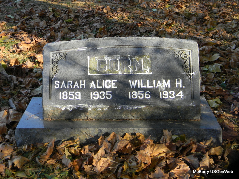 SSW: Sarah Alice - Research Note: William Hendon Corn, son of Payton S. and Terrisa K. Corn, was born Aug. 22, 1856, and departed this life Apr. 30, 1934 at his home, SE of Wheaton. Age, 77 years, 8 months, and 8 days. In 1882 he was married to Cincinnati Hobbs, who preceded him in death July 14, 1885. To this union two children were born, one dying in infancy, the (Payton), at the age of two. He was married again Mar. 20, 1887 to Sarah Alice Davidson. To this union five children were born, three sons and two daughters, all of whom survive him. They are Mrs. Alma Farley of Smithton, MO, Mrs. Luda Sapp of Exeter, Fred of Exeter, and Bert and Wintfred of Wheaton. Besides his companion and five children, he is survived by sixteen grandchildren, one great great grandchild, and a great number of other relatives and friends to mourn his departure. Funeral services were conducted Tuesday afternoon at the Rocky Comfort Baptist Church by Rev. Charles Vanzandt and burial made in the Rocky Comfort Cemetery. - Another Photo | Wheaton Journal Phyllis Long Photo Cheryl Photo Bill Utter |