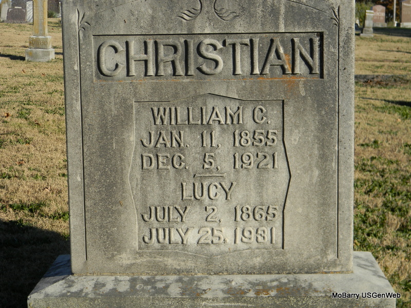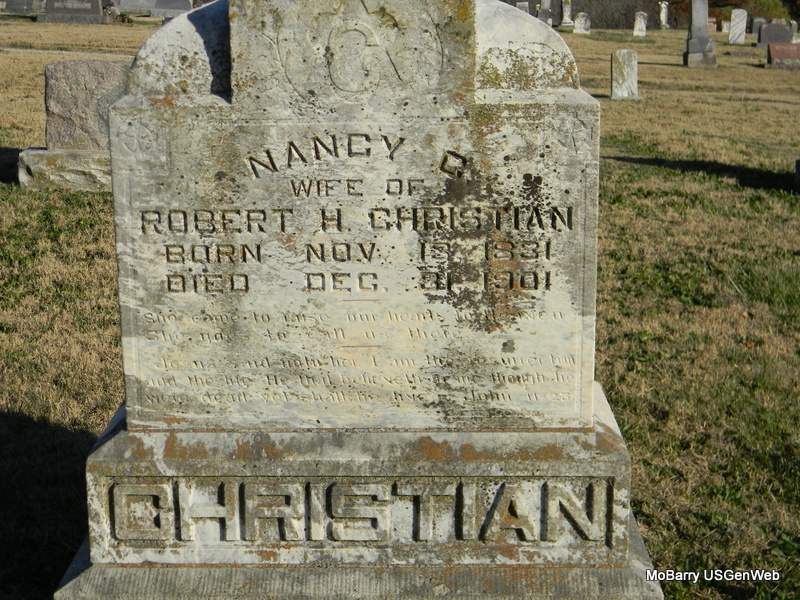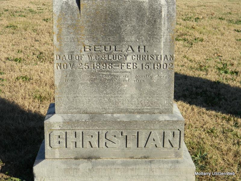 Research Note: Husband maybe Edward C. Carter. - Cassville Republican, Sept. 12, 1918 - Rocky Comfort: Mrs. Belle Carter died in Manitou, Colo., Wednesday where she had gone for the benefit of her health. The body was brought back here for burial. Funeral services were held at the M. E. Church Sunday afternoon and interment was made in the city cemetery. - 1900 Census, Richwood, McDonald, Missouri - Nancy Christian, head, born Nov. 1831 TN, age 68, widowed, married 18 years, mother of 8 children, 4 living, parents born TN; Martha Carter, daughter, born Apr. 1857 MO, age 43, widowed, married 4 years, mother of 1 child, living, parents born TN; Thomas F. Christian, Son, born Aug. 1859, MO, age 40, single, born MO, parents born TN; Robert H. Christian,, son, born Oct. 1864 MO, age 35,single, parents born TN; Lola C. Carter, granddaughter, born Nov. 1880 MO, age 19, father born KY, mother MO; Isaac Haden, servant, black, born Nov. 1854 AR, age 45, single, parents born AR. - 1910 Census, Manitou, El Paso, Colorado - Walter Montgomery, head, age 35 born MO, married 5 years, father born TX, mother IA, retail merchant; Lola C., wife, age 29, married 5 years, mother of 1 child, living, born MO, father born KY, mother MO; George C., son, age 4, born MO; Belle Carter, mother-in-law, age 52, widowed, born MO, parents born TN. | Online Newspapers Census Phyllis Long Photo Bill Utter |